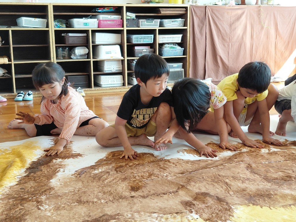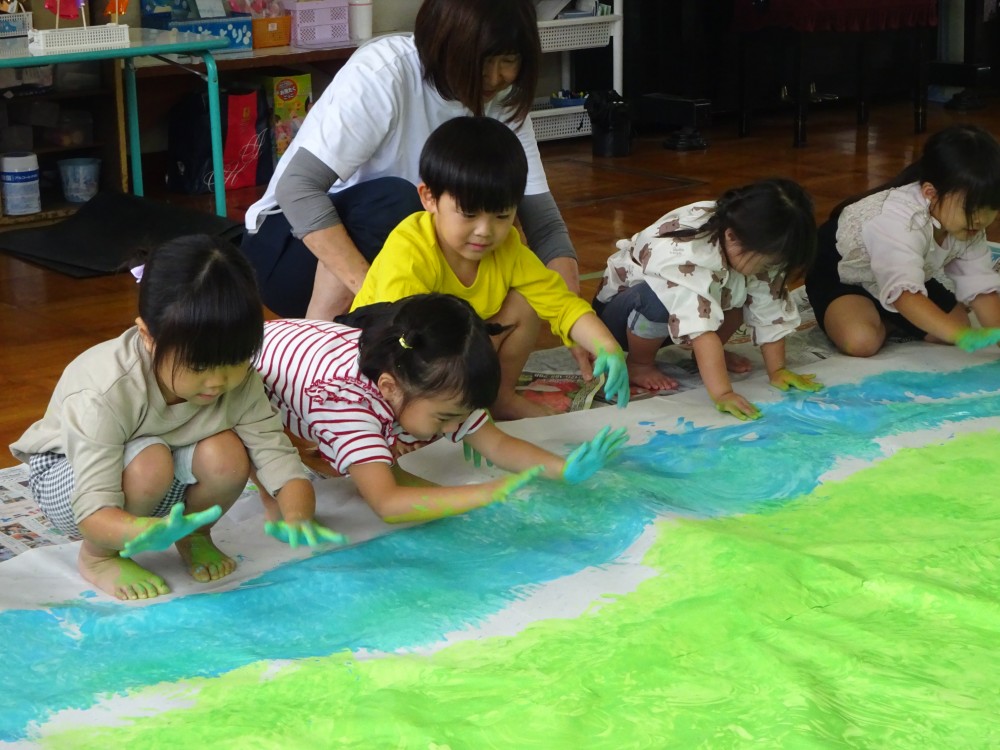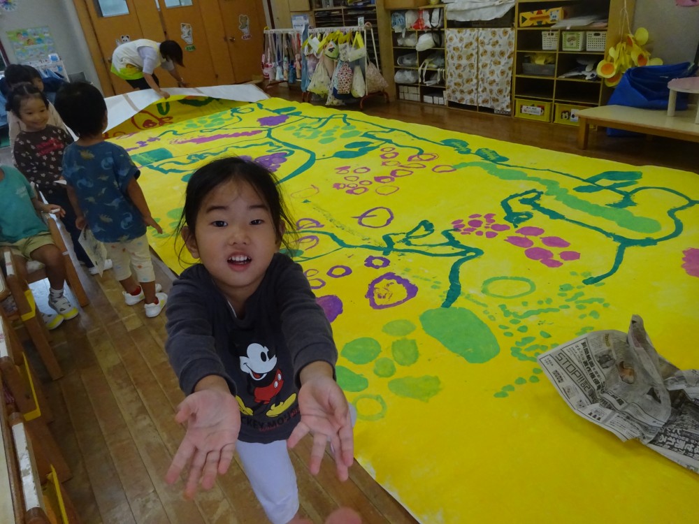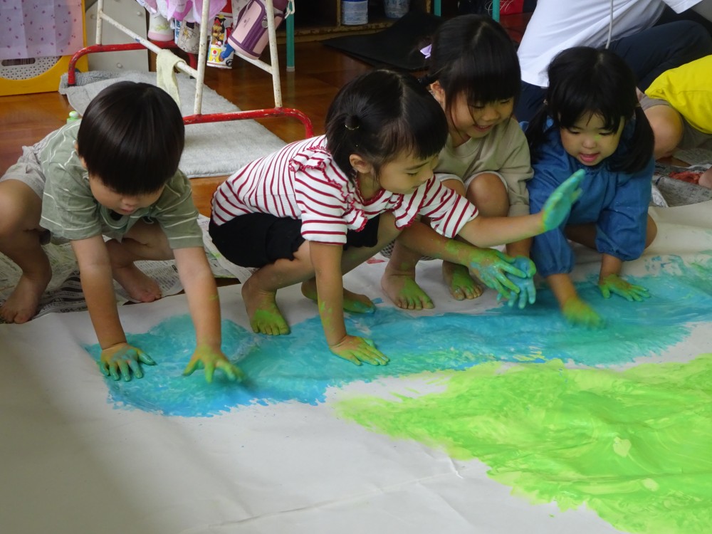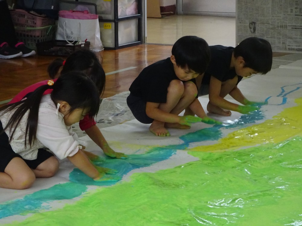 年中組からもペタペタペタペタとたくさんの音が聞こえてきました。「おもしろい」「色、もっとちょうだい」 「なんか混ざった」と張り切っていました。