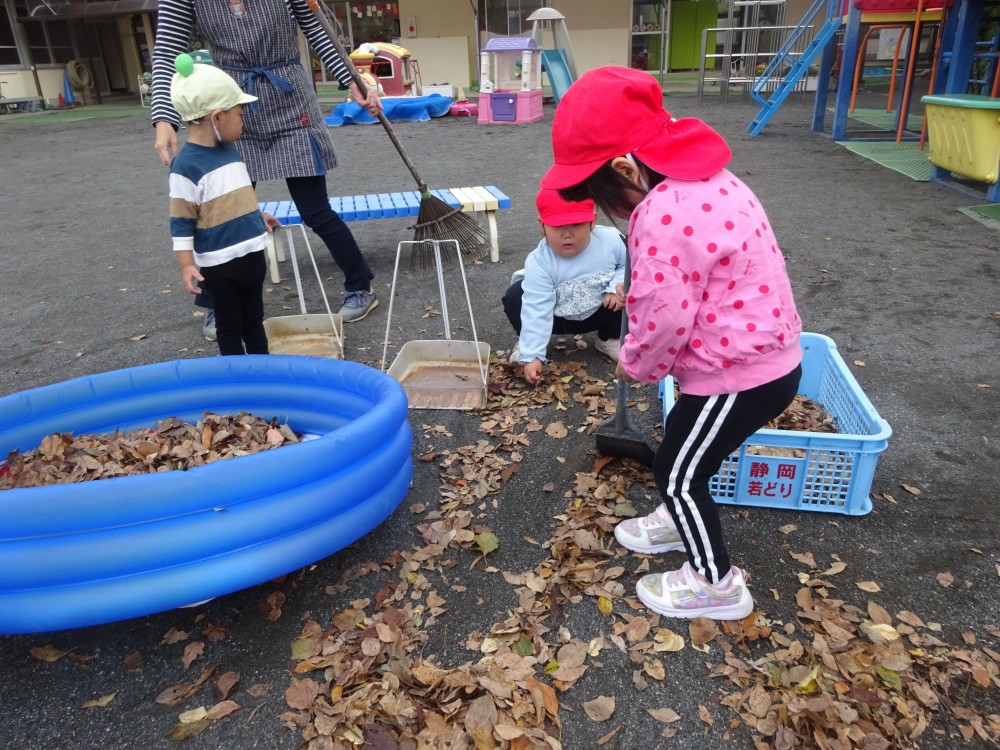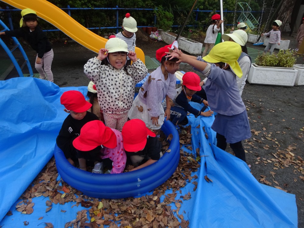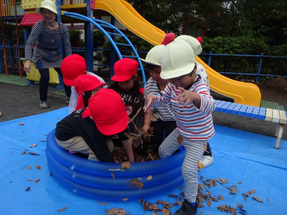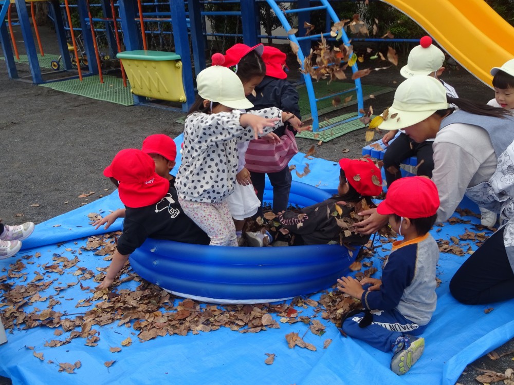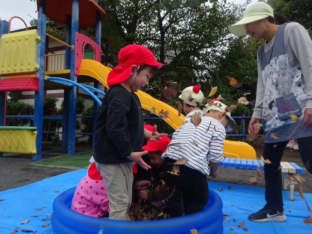 落ち葉も、子どもたちにとっては宝物の1つ。落ち葉を集めて、落ち葉プールを作ってみました。大喜びで楽しんでいました。