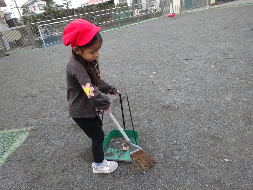 入室前には、年少組が片付けを楽しみながらしてくれました。ホウキや塵取りの使い方も遊びの中で。どこを持ったらうまく集められるのか、向きはどうかなど、使う中で扱い方に気付いていきます。