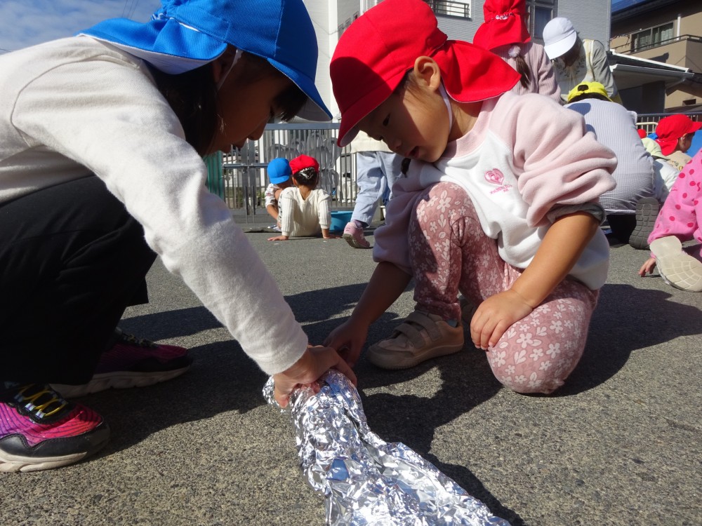 年長組は自分の芋を包むと年中や年少のお手伝いに取り掛かりました。