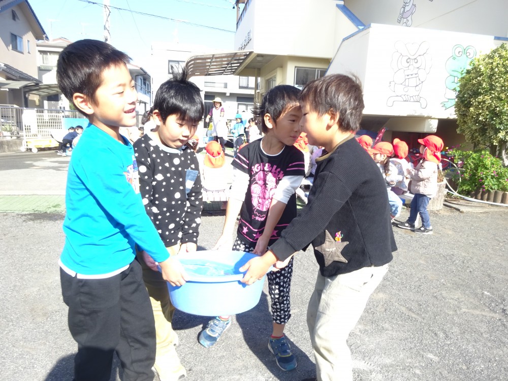 年少さんは「今日は寒いってママが言っていたからお水も冷たくなっちゃった」「ごしごししたらピカピカになった」と気付いたり感じたりしたことを言葉にしていました。