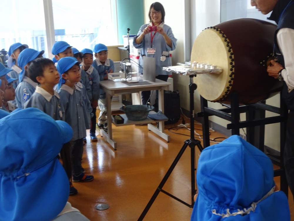 太鼓を叩いた振動で、ろうそくの灯がどうなるのかを実験しました。