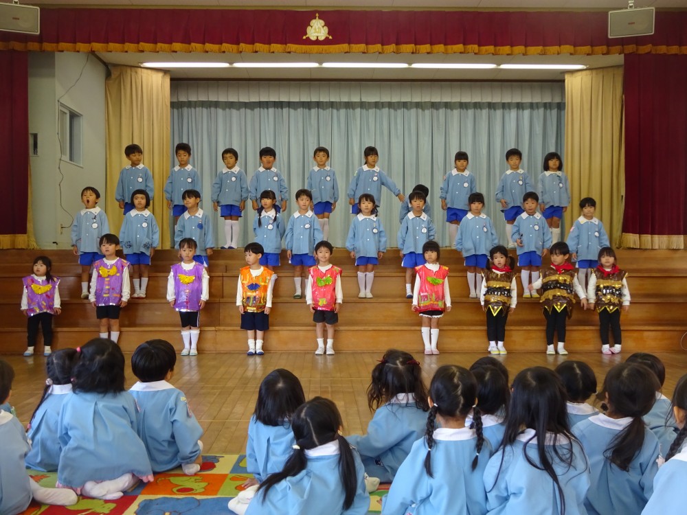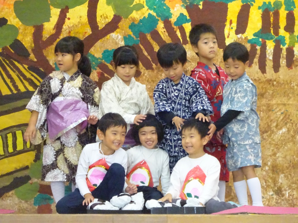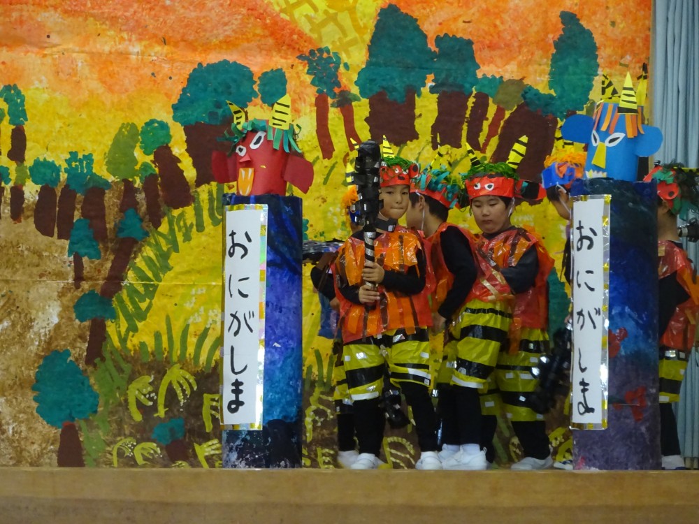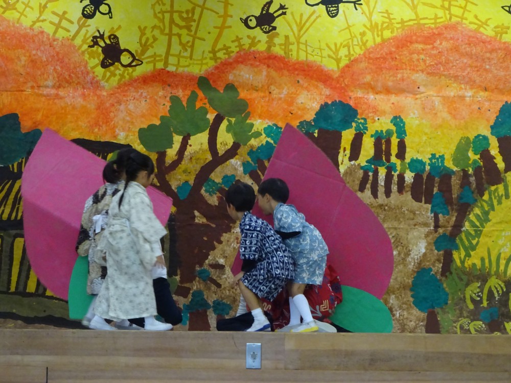 二役の子は舞台裏で着替えるため大忙し。何も言わずにお面をつけるのを手伝ってあげていた子もいたそうです。