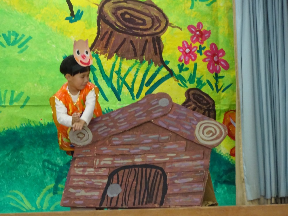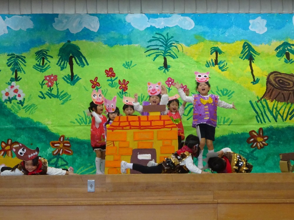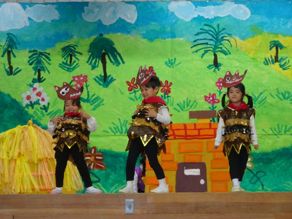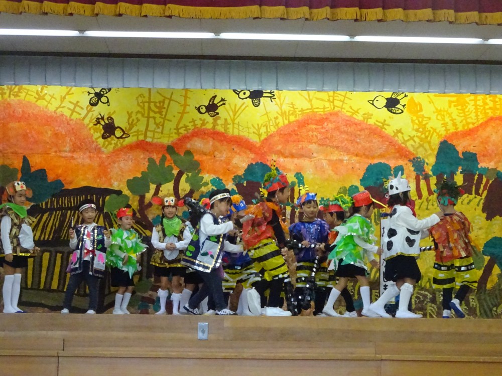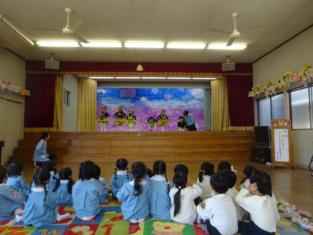 二役の子は舞台裏で着替えるため大忙し。何も言わずにお面をつけるのを手伝ってあげていた子もいたそうです。
