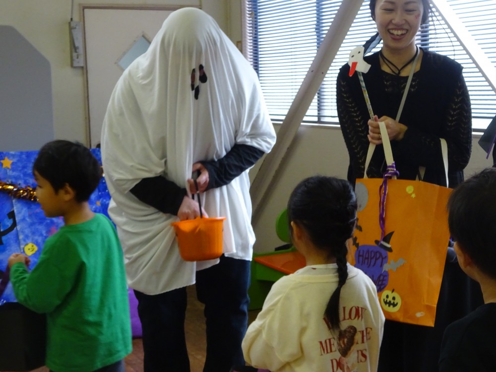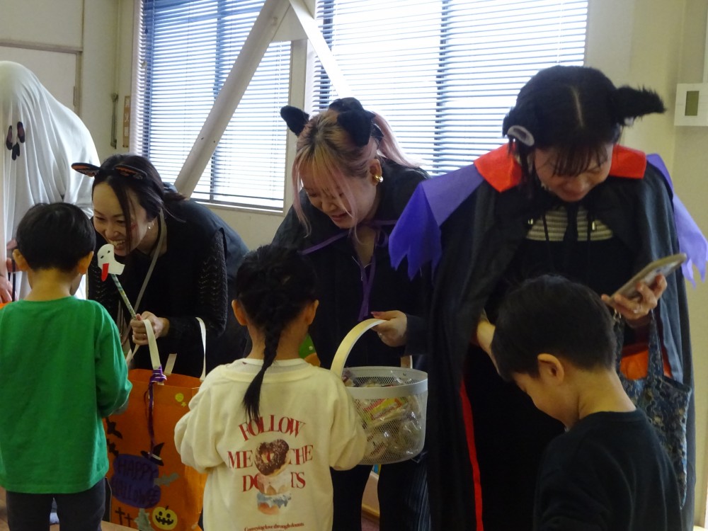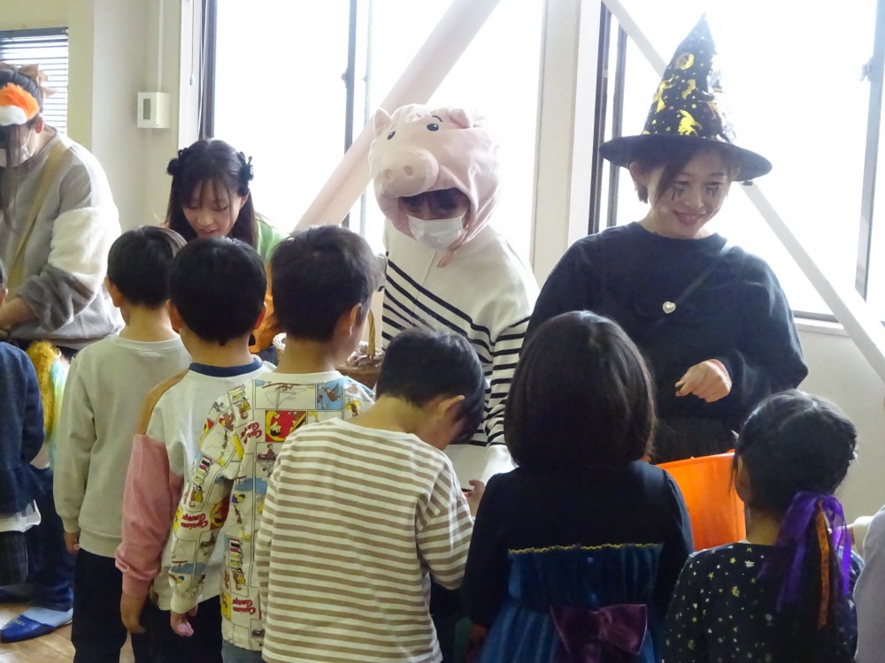 年長組から順番に仮装した有志の皆さんのもとへ。さっそくお菓子をもらいました。