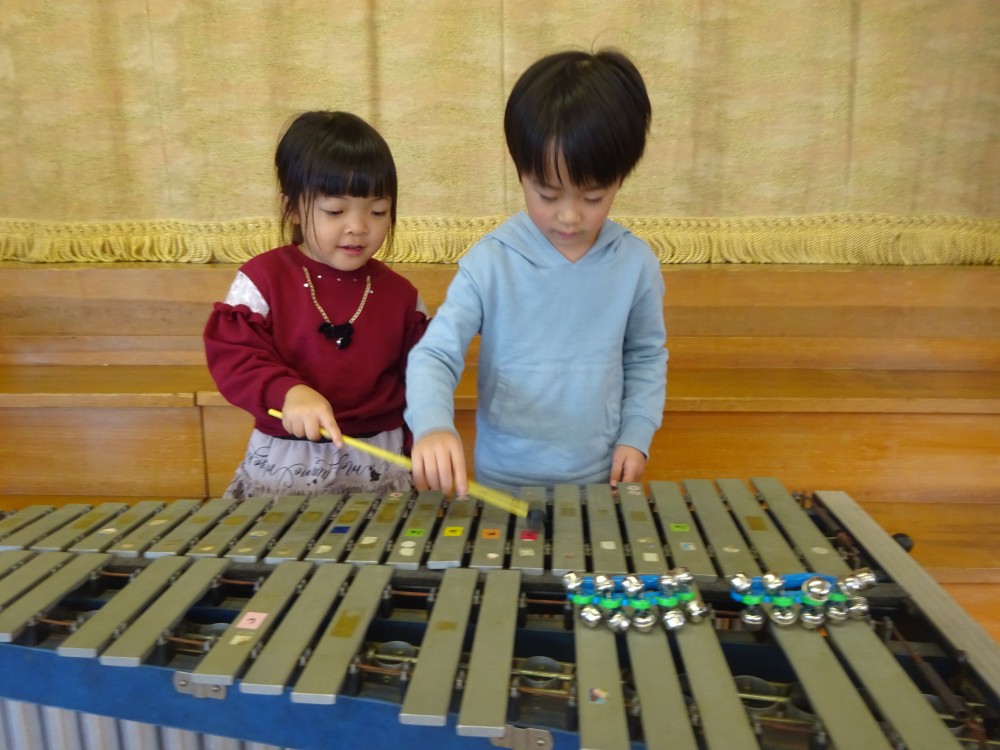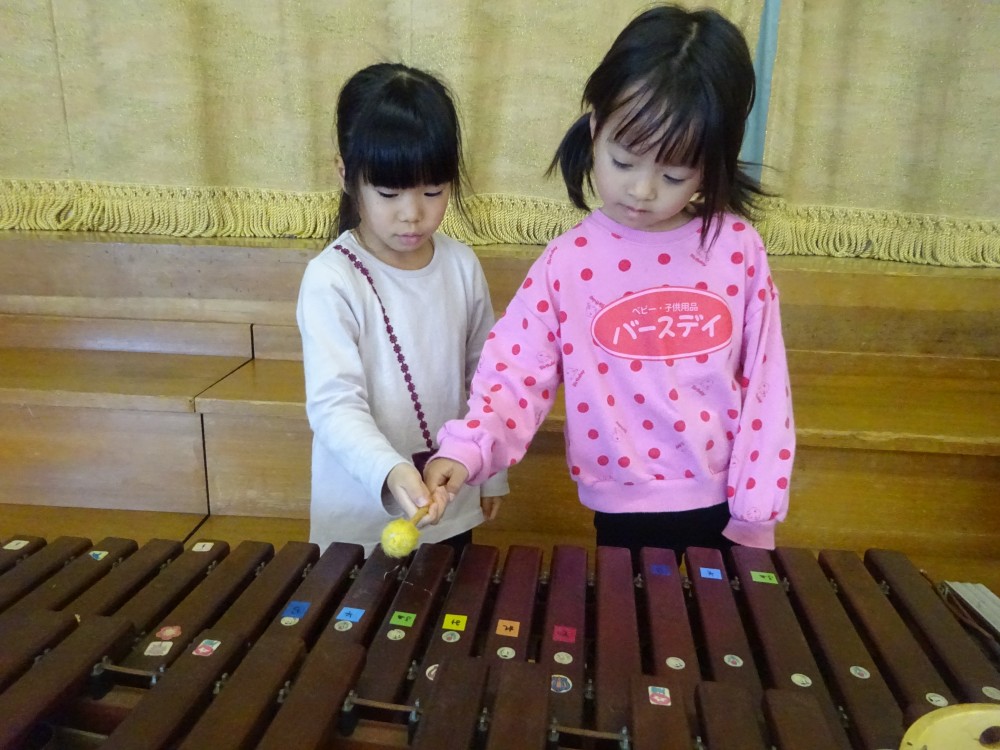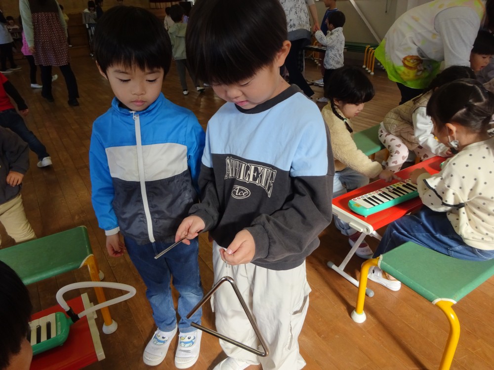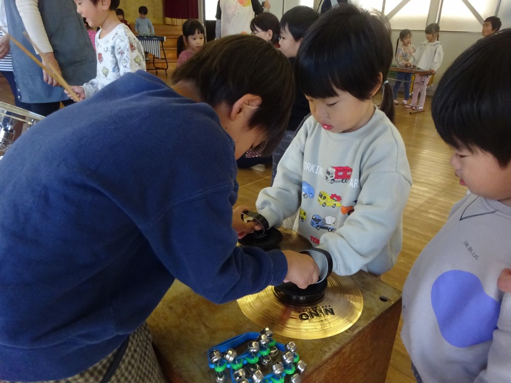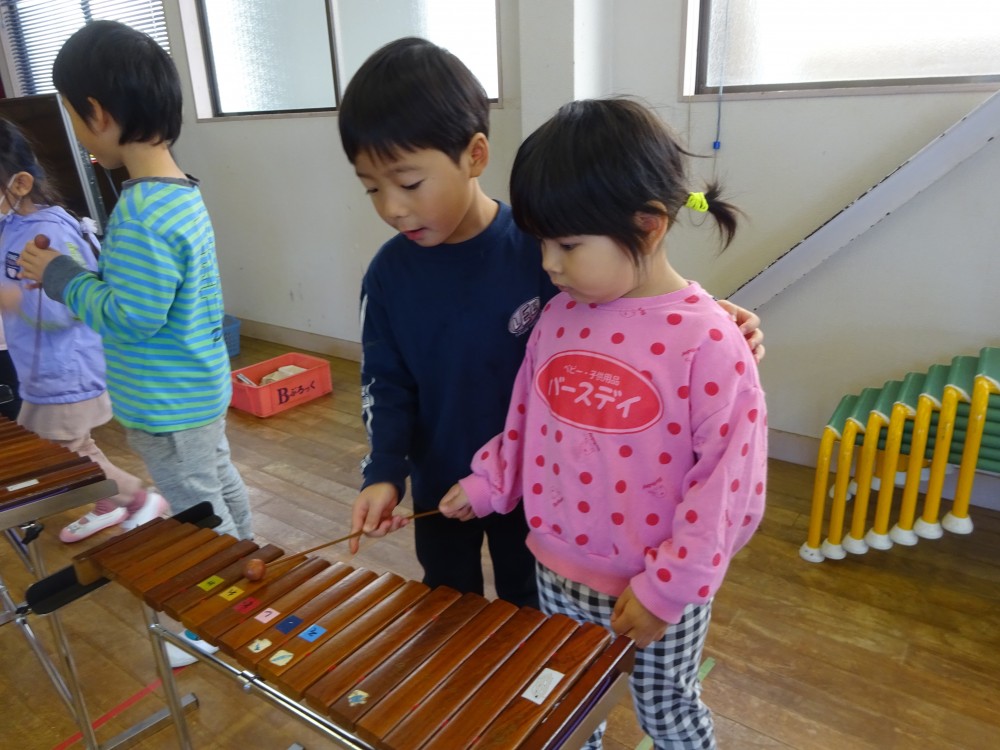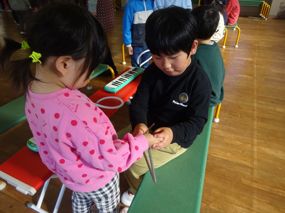 発表会や見せ合う会で楽器に興味を持っていた子どもたちは、喜んで教えてもらっていました。年長組は優しく丁寧に教えていました。