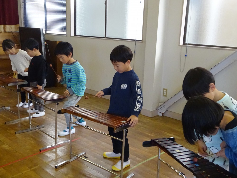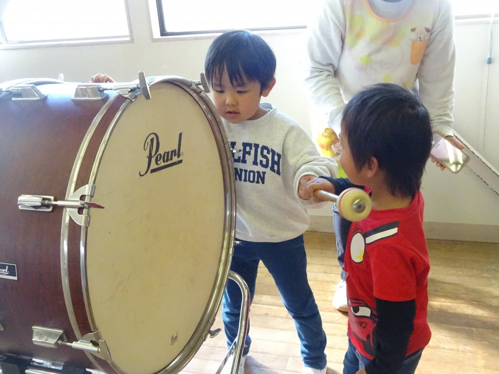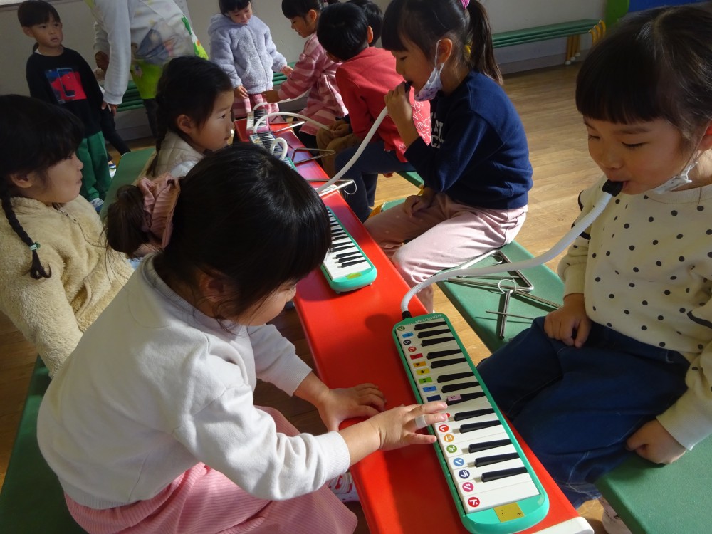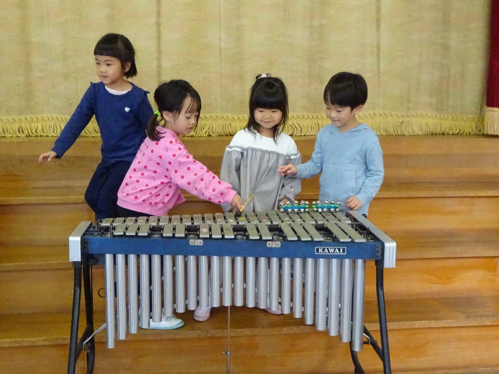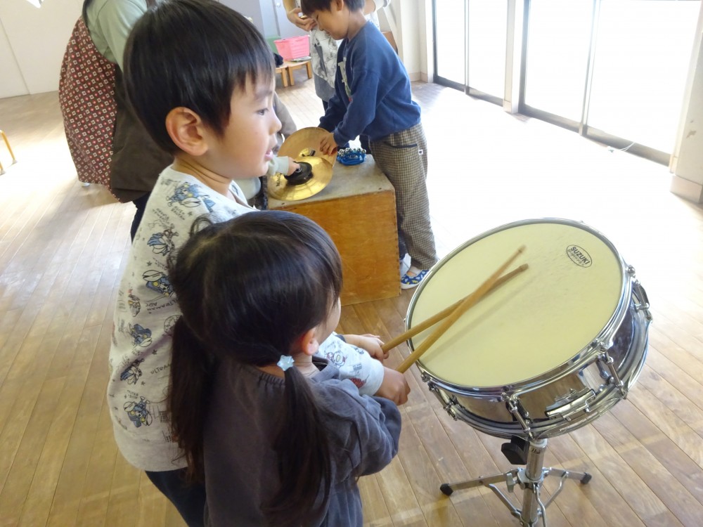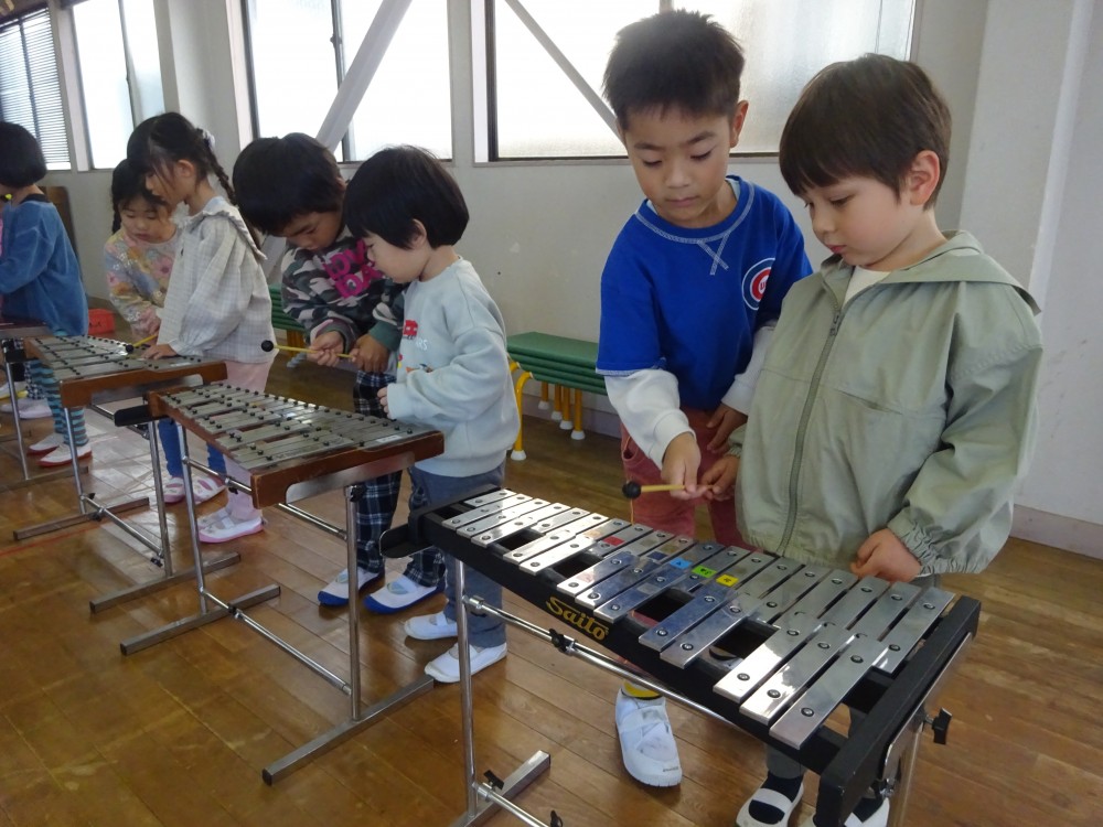 発表会や見せ合う会で楽器に興味を持っていた子どもたちは、喜んで教えてもらっていました。年長組は優しく丁寧に教えていました。