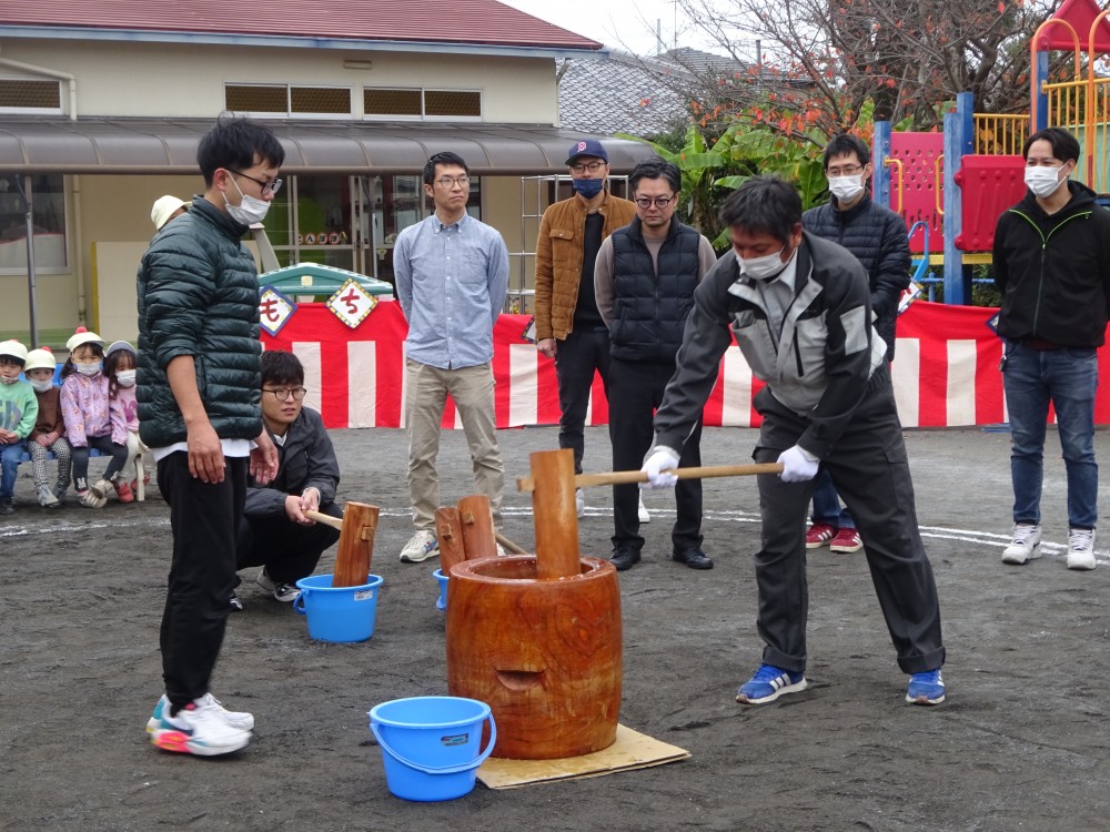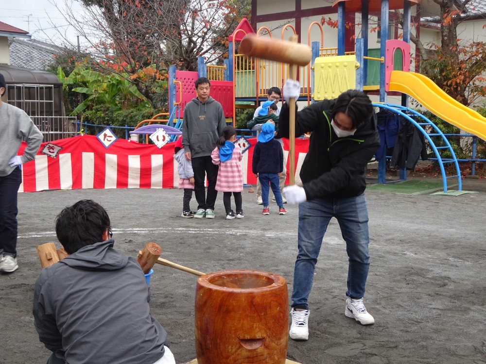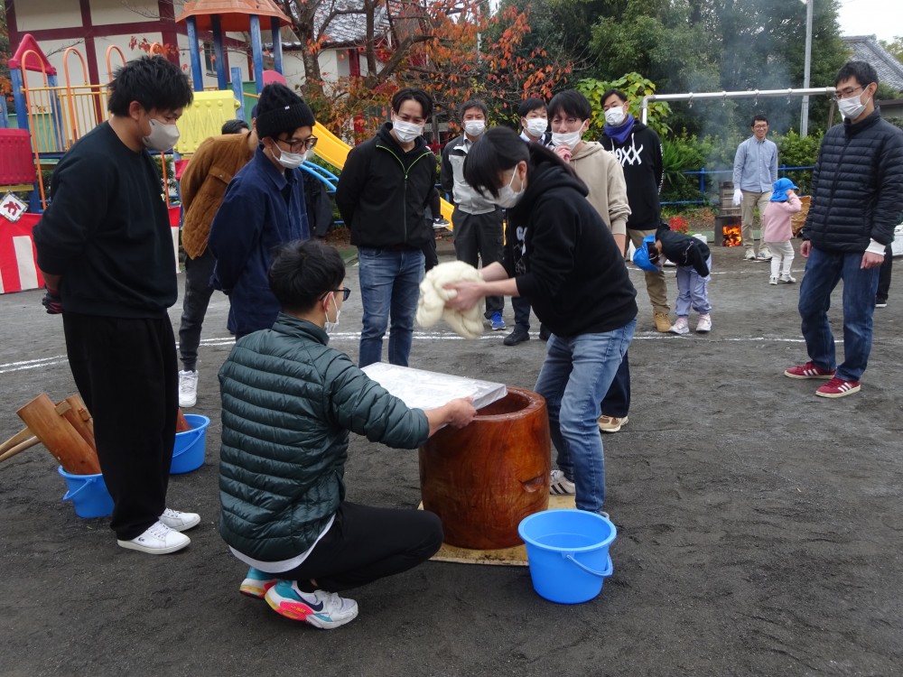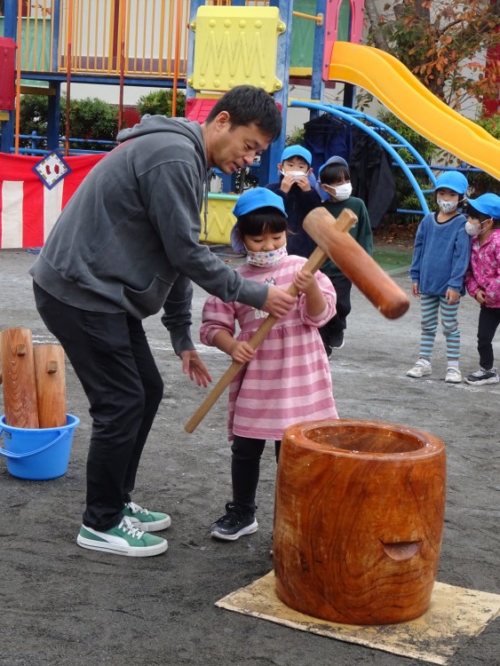 お父さんたちに手伝ってもらって、子どもたちももちをつきました。