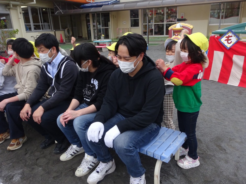 手伝ってくれたお父さんたちに、子どもたちが肩たたきのプレゼントを。