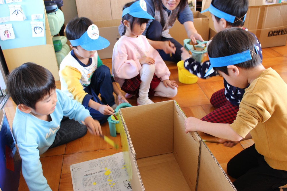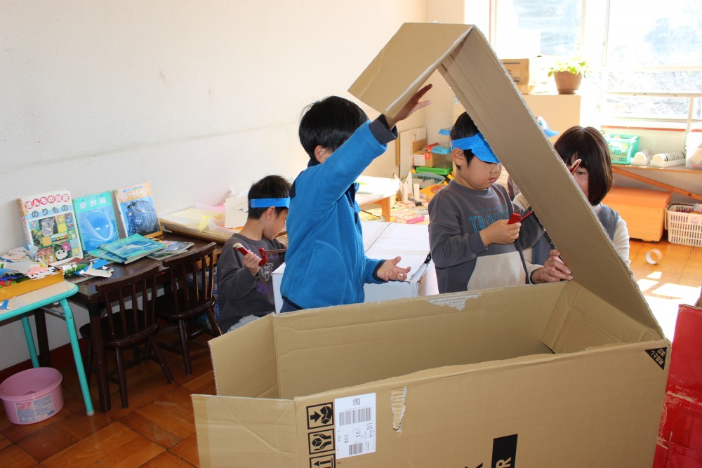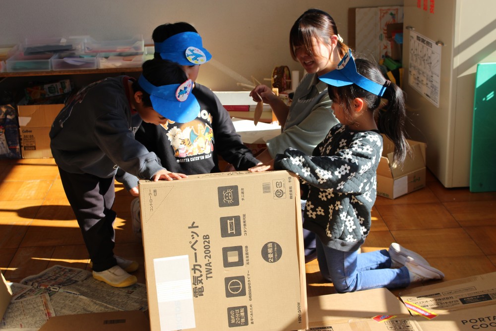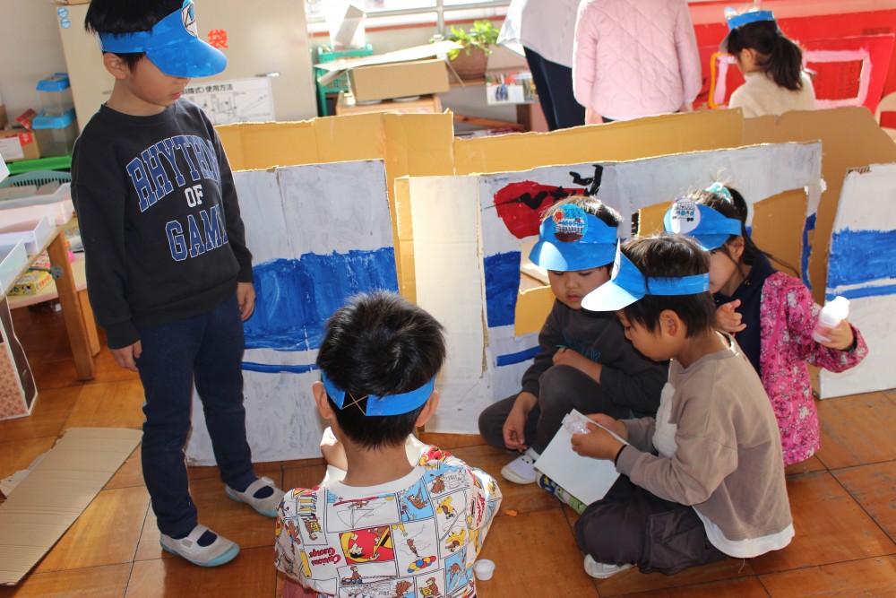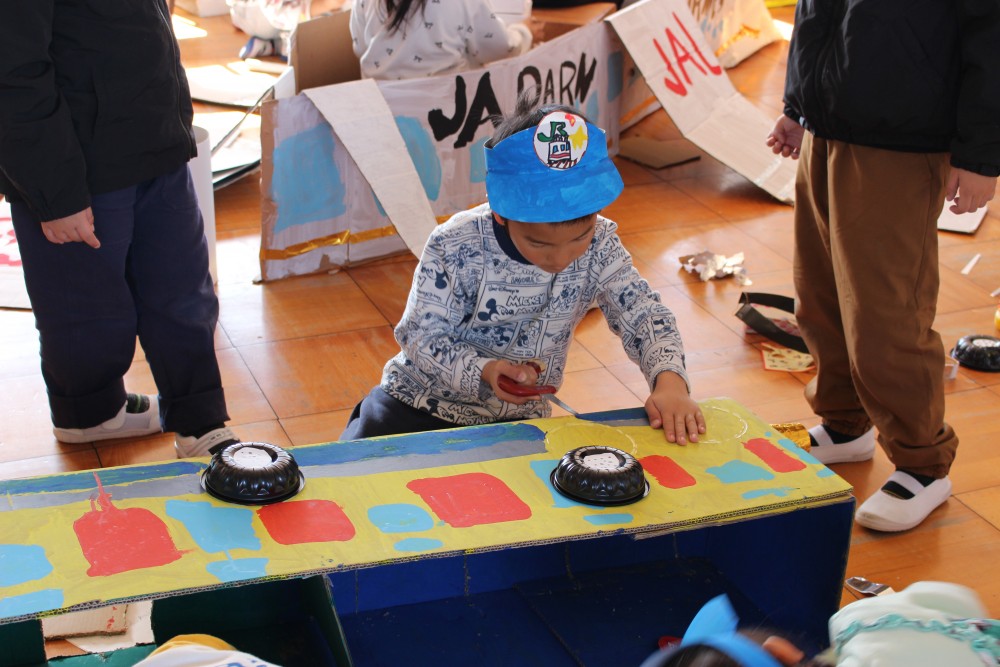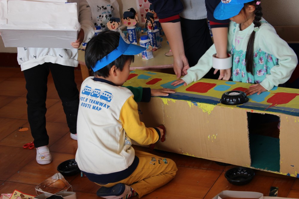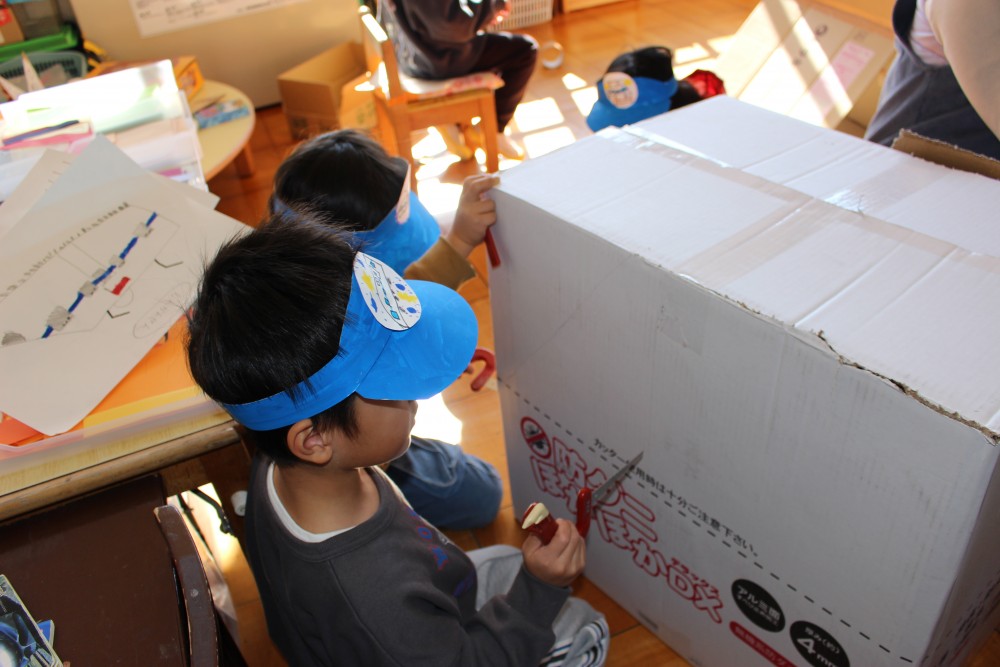 「人が乗れる乗り物を作ろう!」と大型の乗り物作りが始まりました。段ボールを組み合わせて、段ボールカッターで窓やドア部分をあけていました。