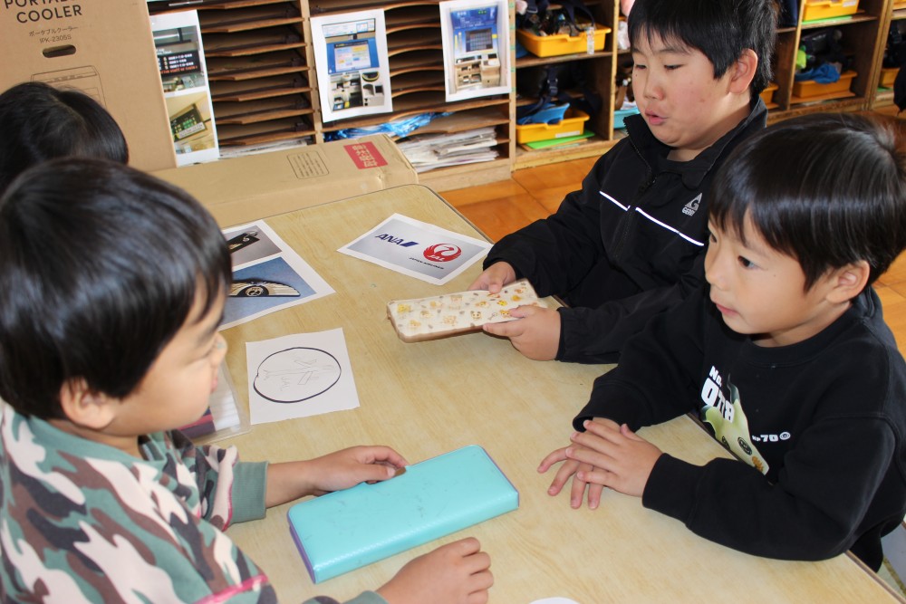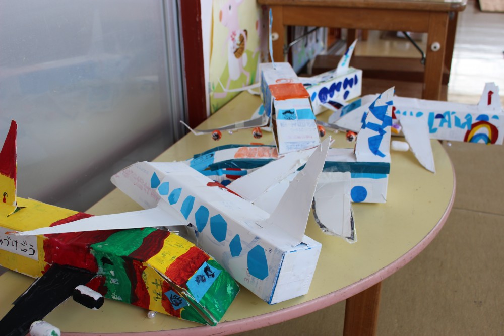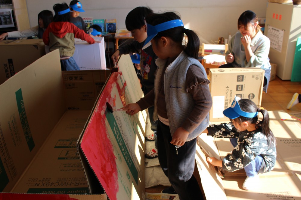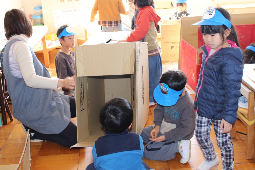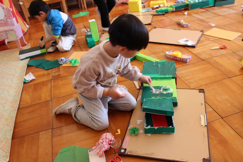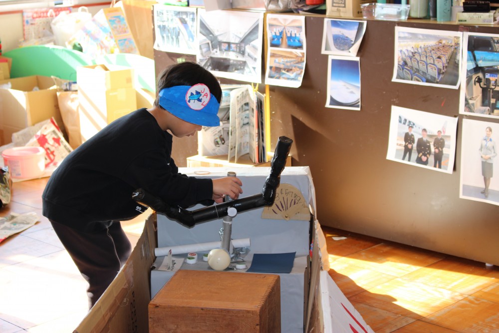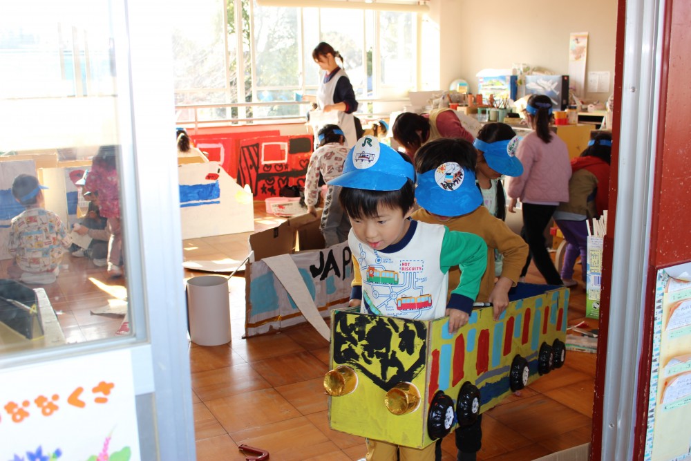 「人が乗れる乗り物を作ろう!」と大型の乗り物作りが始まりました。段ボールを組み合わせて、段ボールカッターで窓やドア部分をあけていました。
