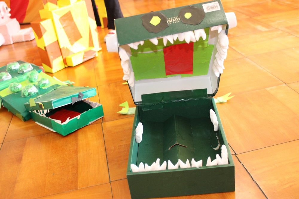 自分のデザイン画を基に乗り物を作りました。動くように工夫されています。