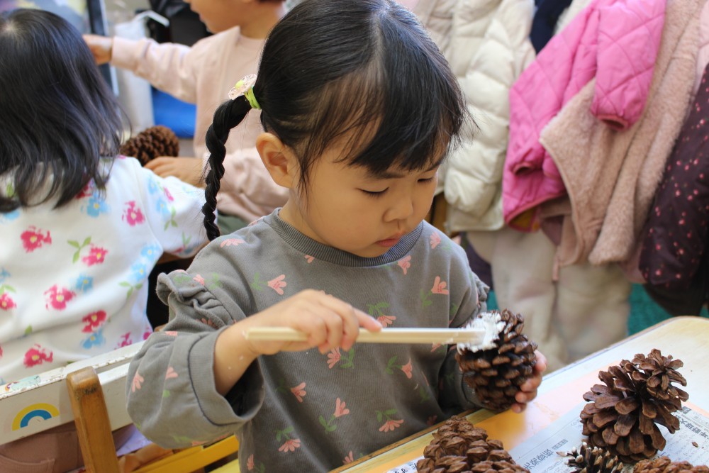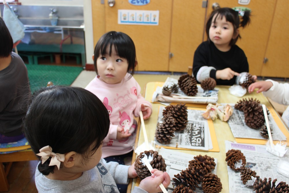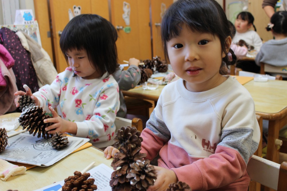 年少組では大きなまつぼっくりを使って製作活動をしていました。真剣なまなざしでボンドを着け、重ね合わせていました。