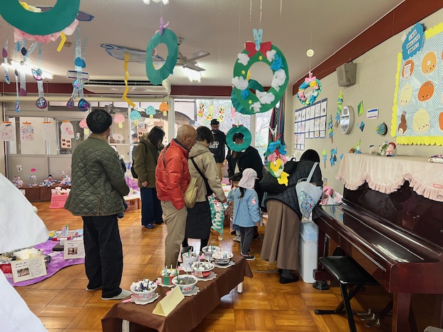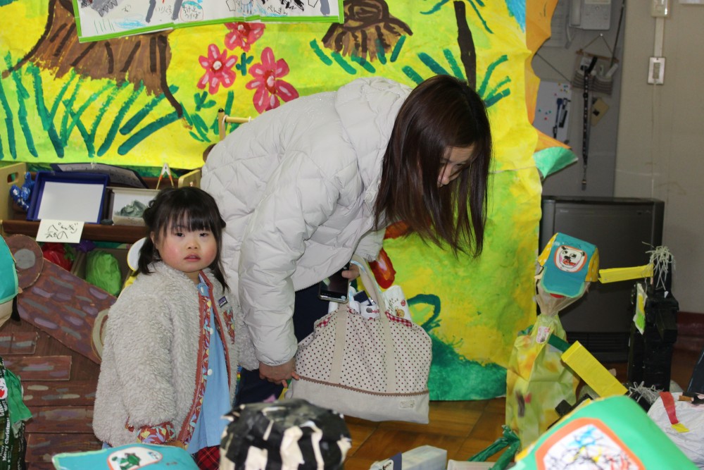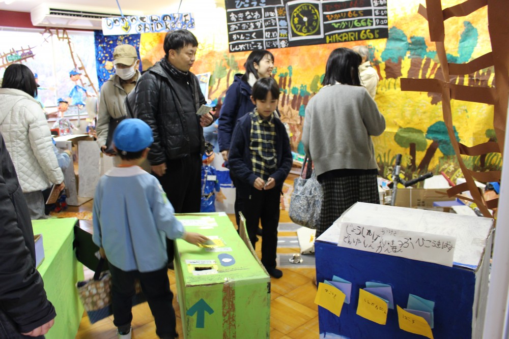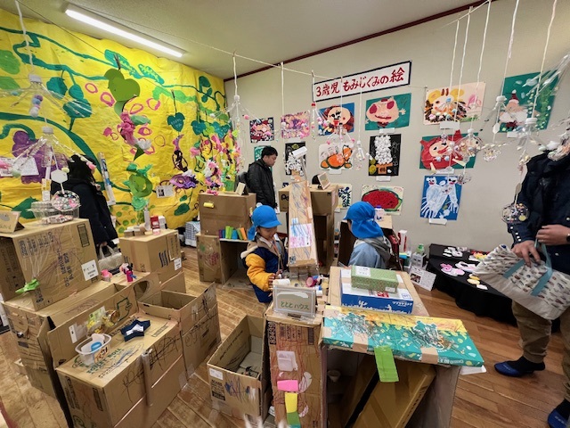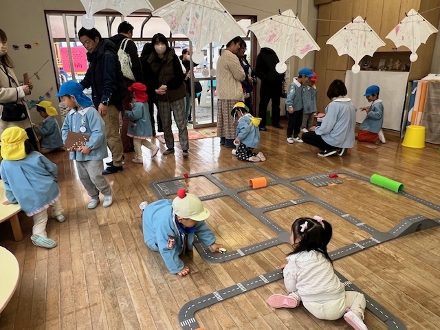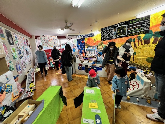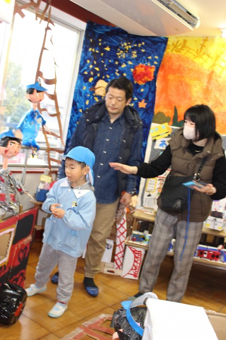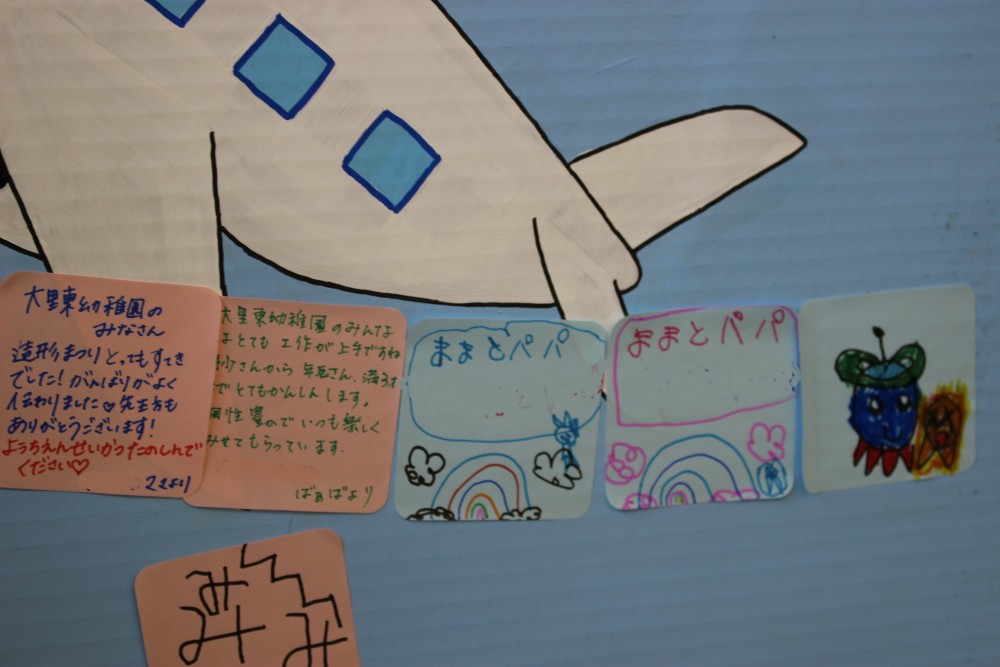 前日、年長は「楽しみだね」「お客さんいっぱい来るかな~?」「明日いっぱい遊ぼうぜ」「みんな明日ね~」と友達と声を掛け合っていました。当日は、小雨の降る中での造形まつりでしたが、子どもたちはおうちの人に見てもらえるのが嬉しくてにこにこ顔でした
