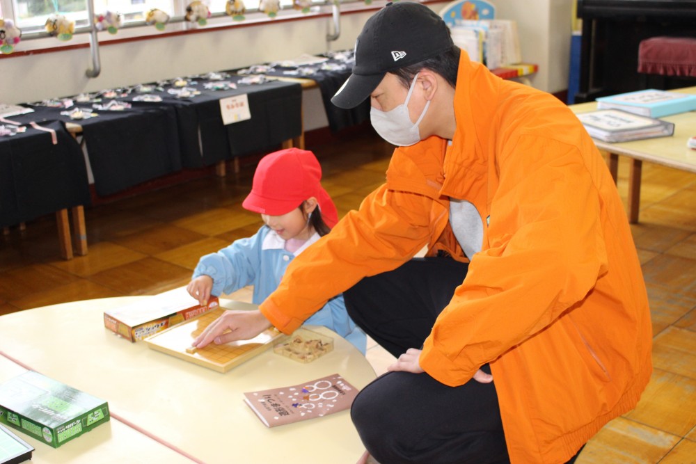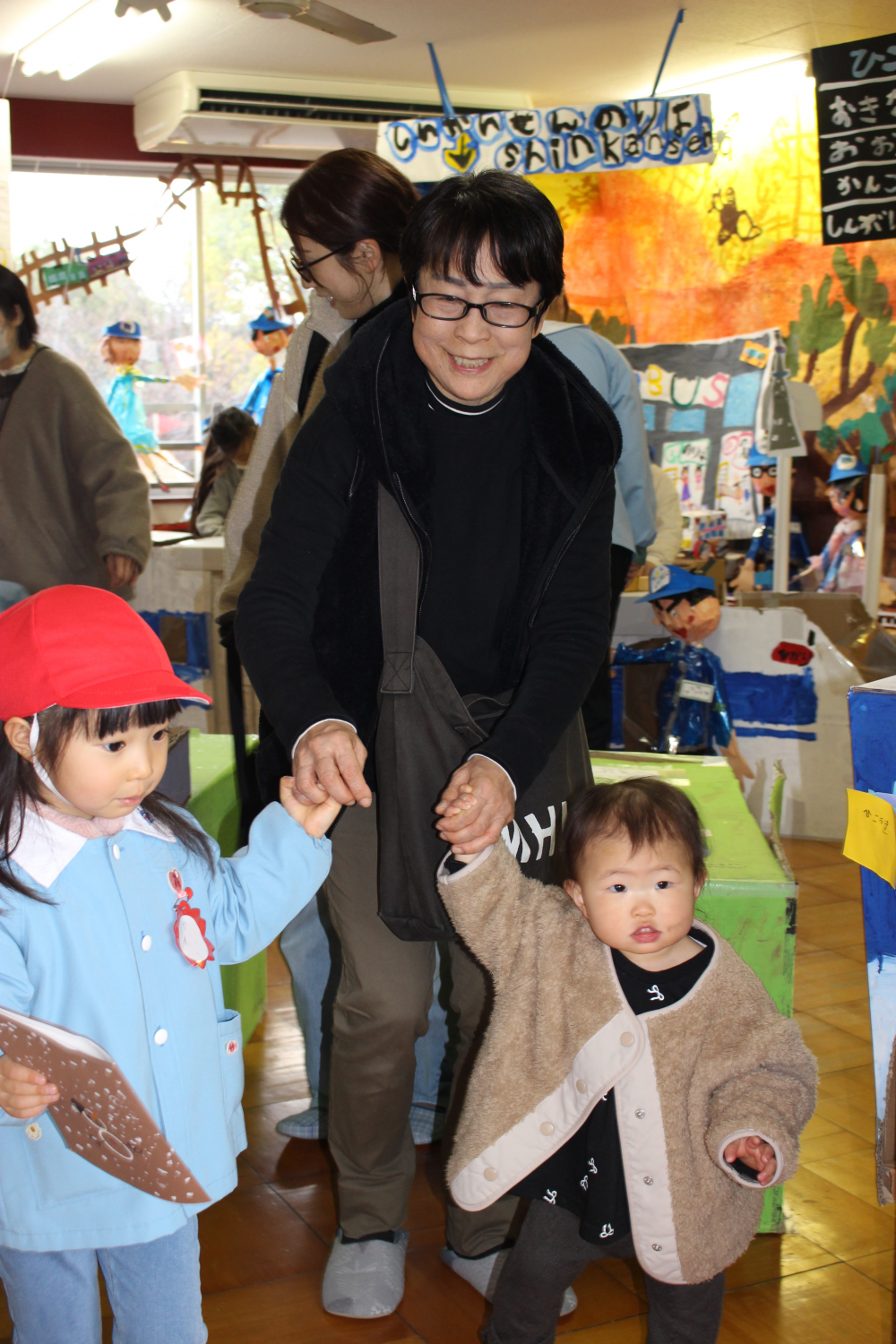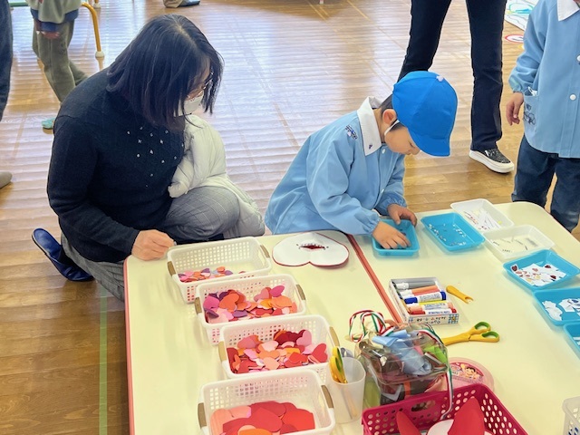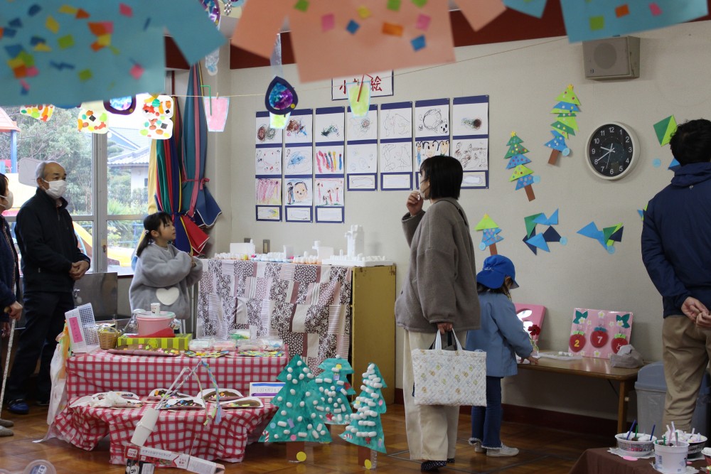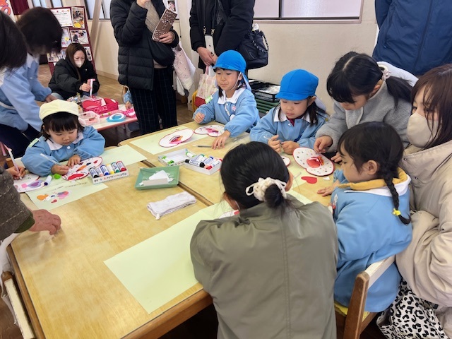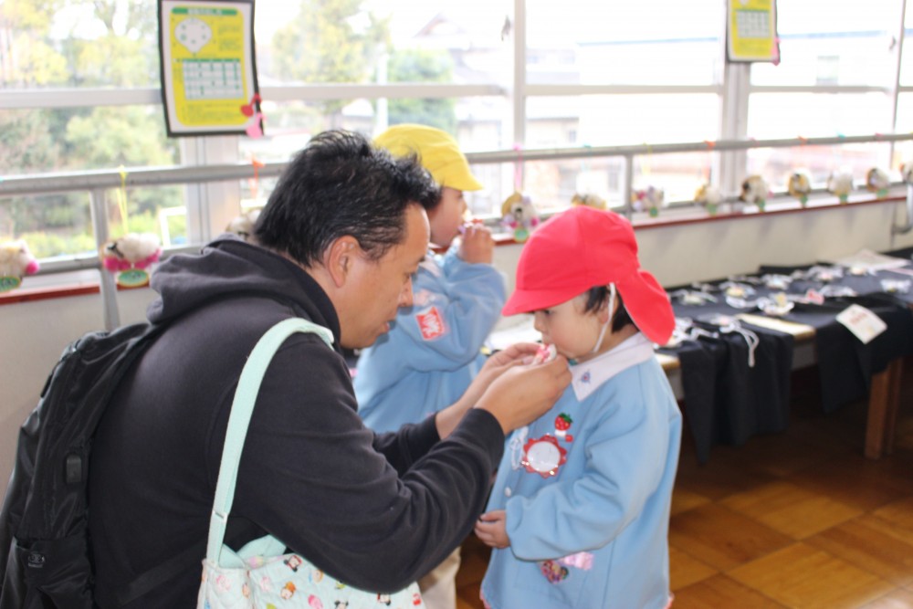 前日、年長は「楽しみだね」「お客さんいっぱい来るかな~?」「明日いっぱい遊ぼうぜ」「みんな明日ね~」と友達と声を掛け合っていました。当日は、小雨の降る中での造形まつりでしたが、子どもたちはおうちの人に見てもらえるのが嬉しくてにこにこ顔でした