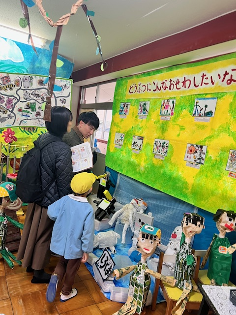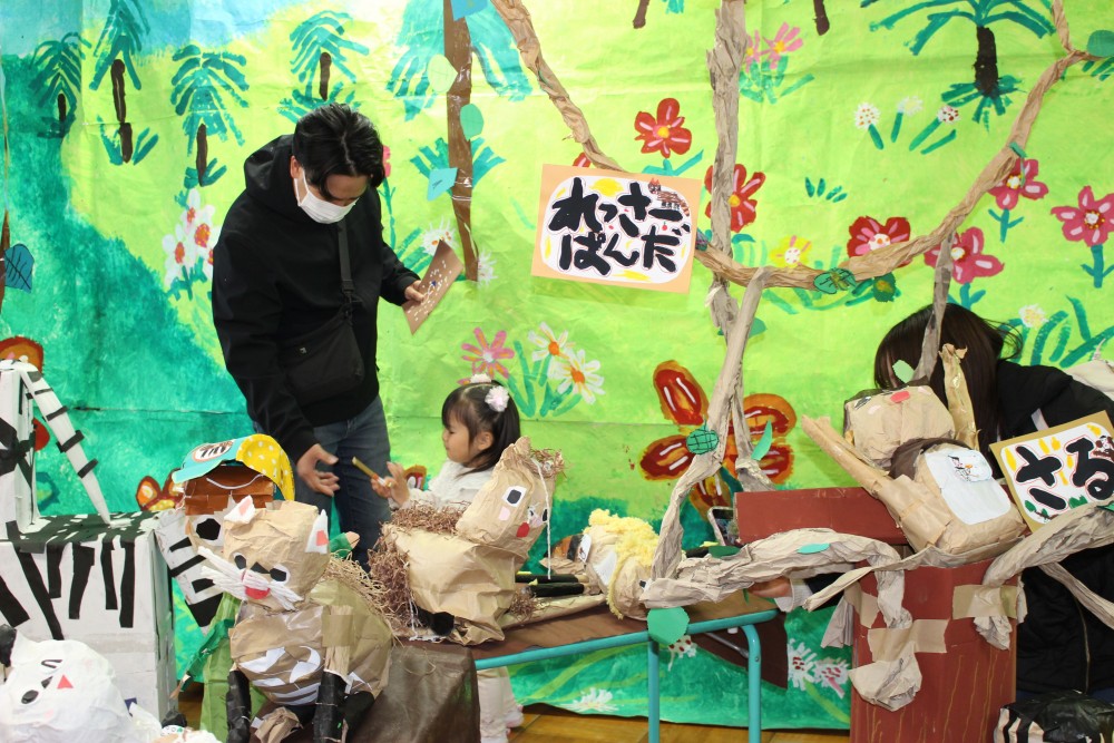 箱を組み合わせて作った動物や袋を使って作った動物、友達と作った大きな動物たちがお客さんを出迎えました。