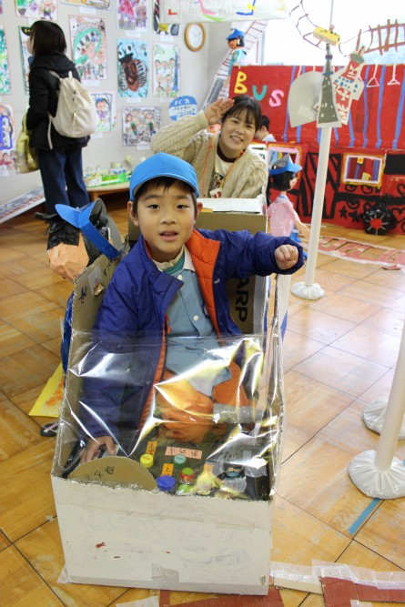 乗り物のデザイン画をもとに作った個人製作は動かすことができるので、おうちの人に知らせていました。乗れる乗り物への案内は、得意気でした。実際に乗ってもらえたのでとても喜んでいました。小さい組の子どもたちも喜んでいました。