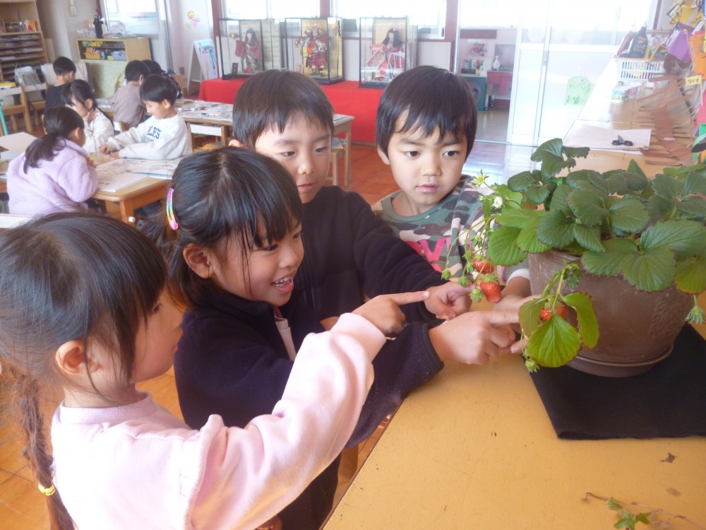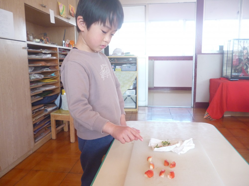「イチゴが赤くなったら20人で分ける」と言っていたように、赤くなった3つのイチゴを20等分にして分けました。