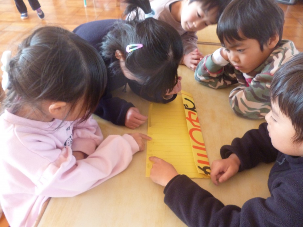 イチゴの食べる順番をどうするのか話し合い、順番を決めるあみだくじを作りました。グループの代表があみだくじに名前を書く順番を決めるジャンケンをしました。