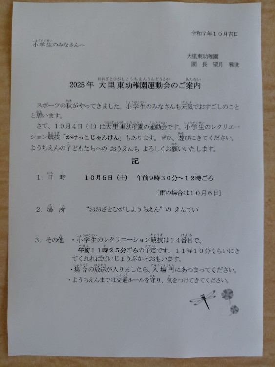 10月4日(土)は、大里東幼稚園の運動会です。小学生のレクリエーション競技もあります。