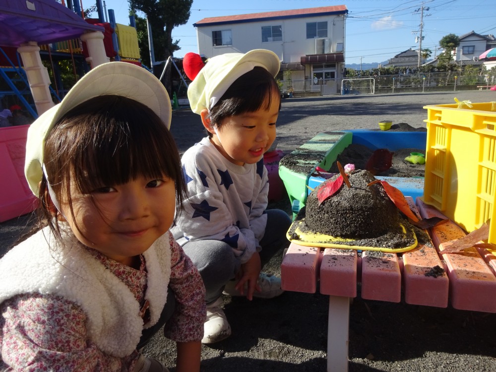 砂のケーキを作ってご馳走してくれました。残しておくと部屋の前に移動させていました。明日、残っているかな?